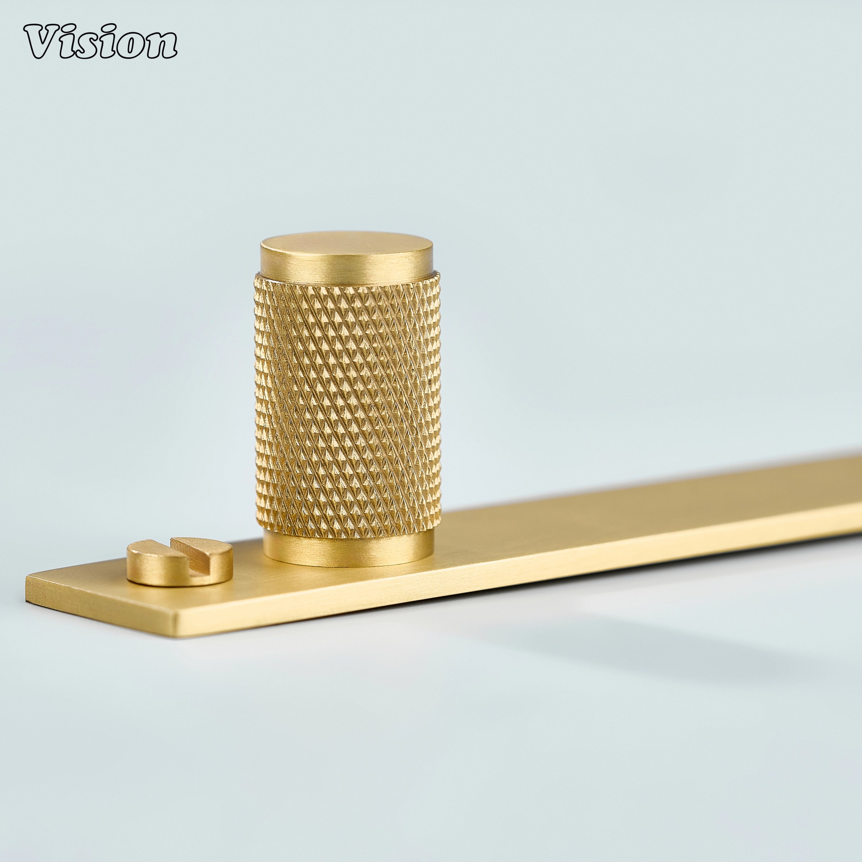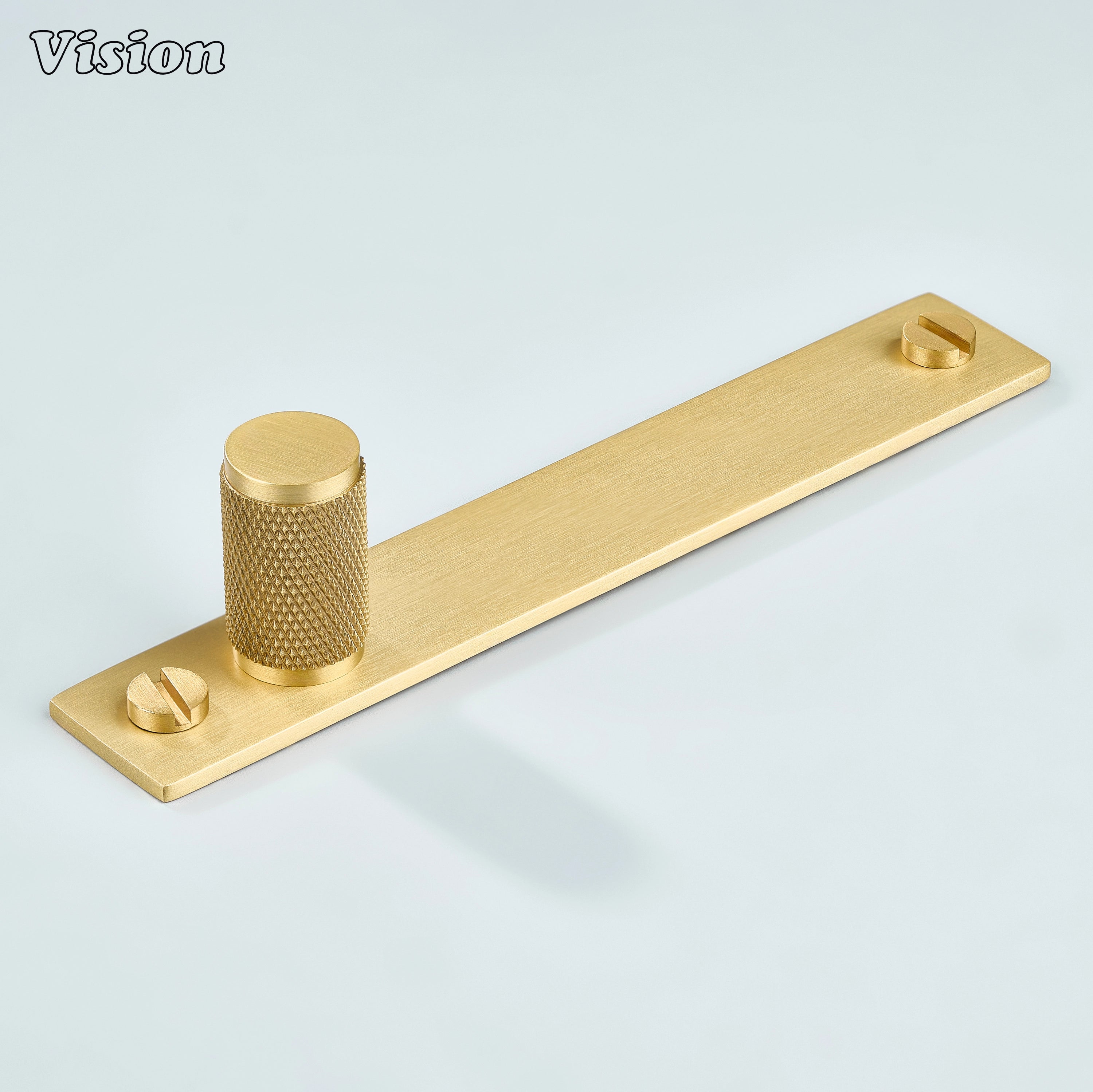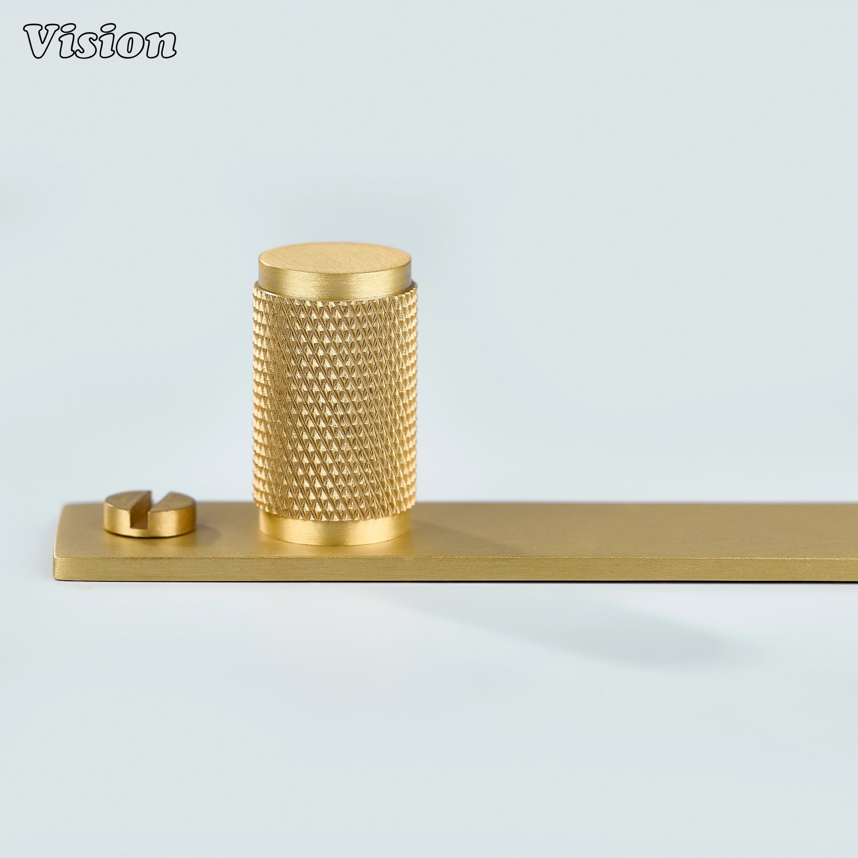 Meridian Knurled Brass Cylinder Knob With Backplate – Gold cabinet knob features a cylindrical diamond knurled profile mounted on a slim rectangular backplate, crafted from premium solid brass with a refined build for kitchen cabinets, wardrobes, drawers, and furniture.