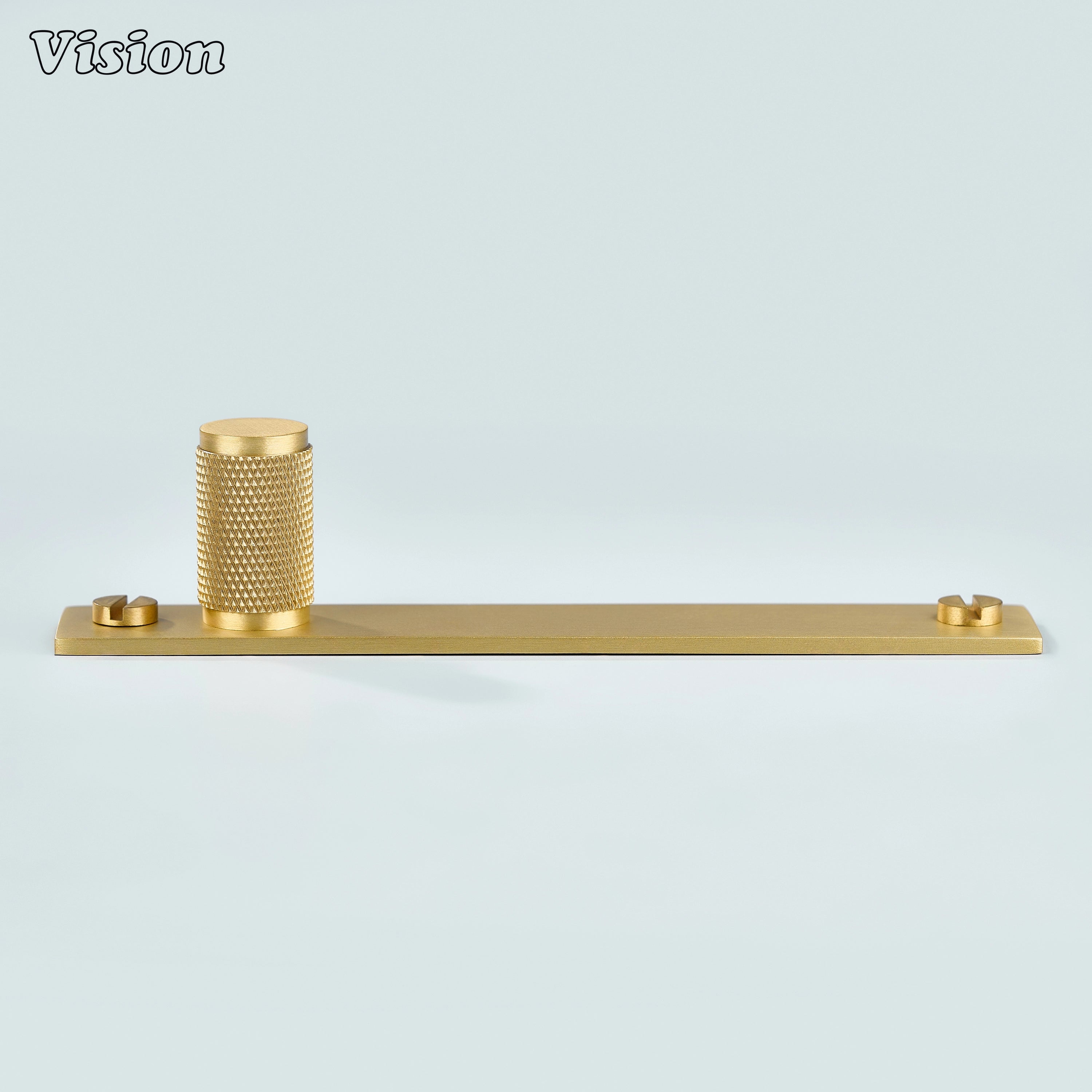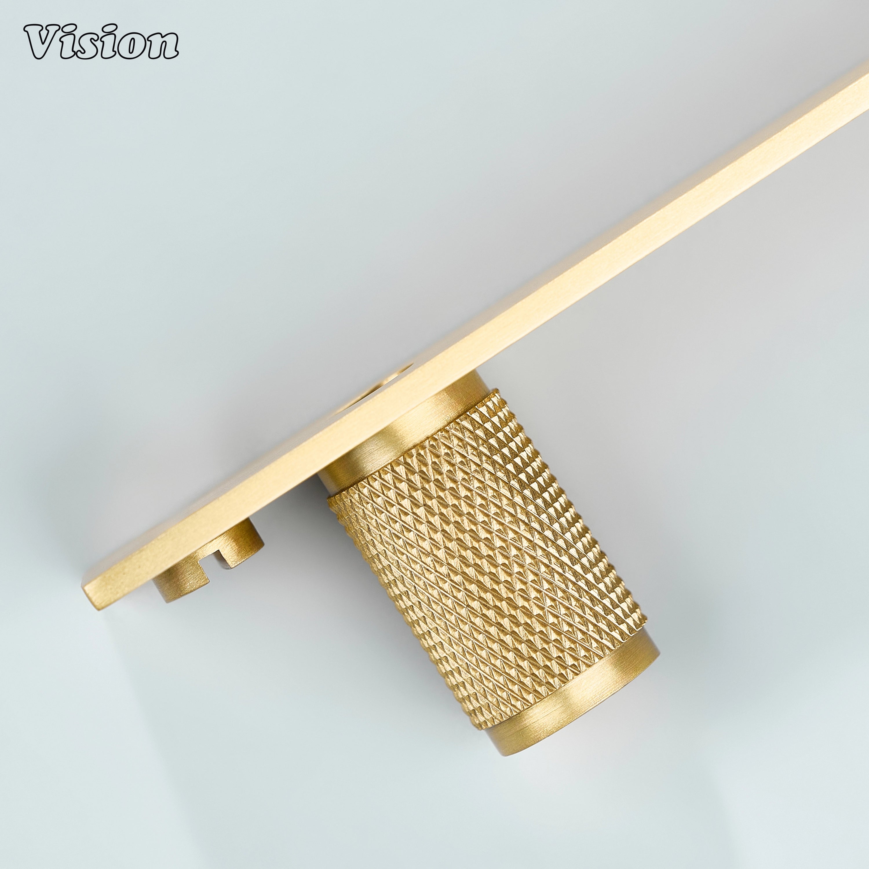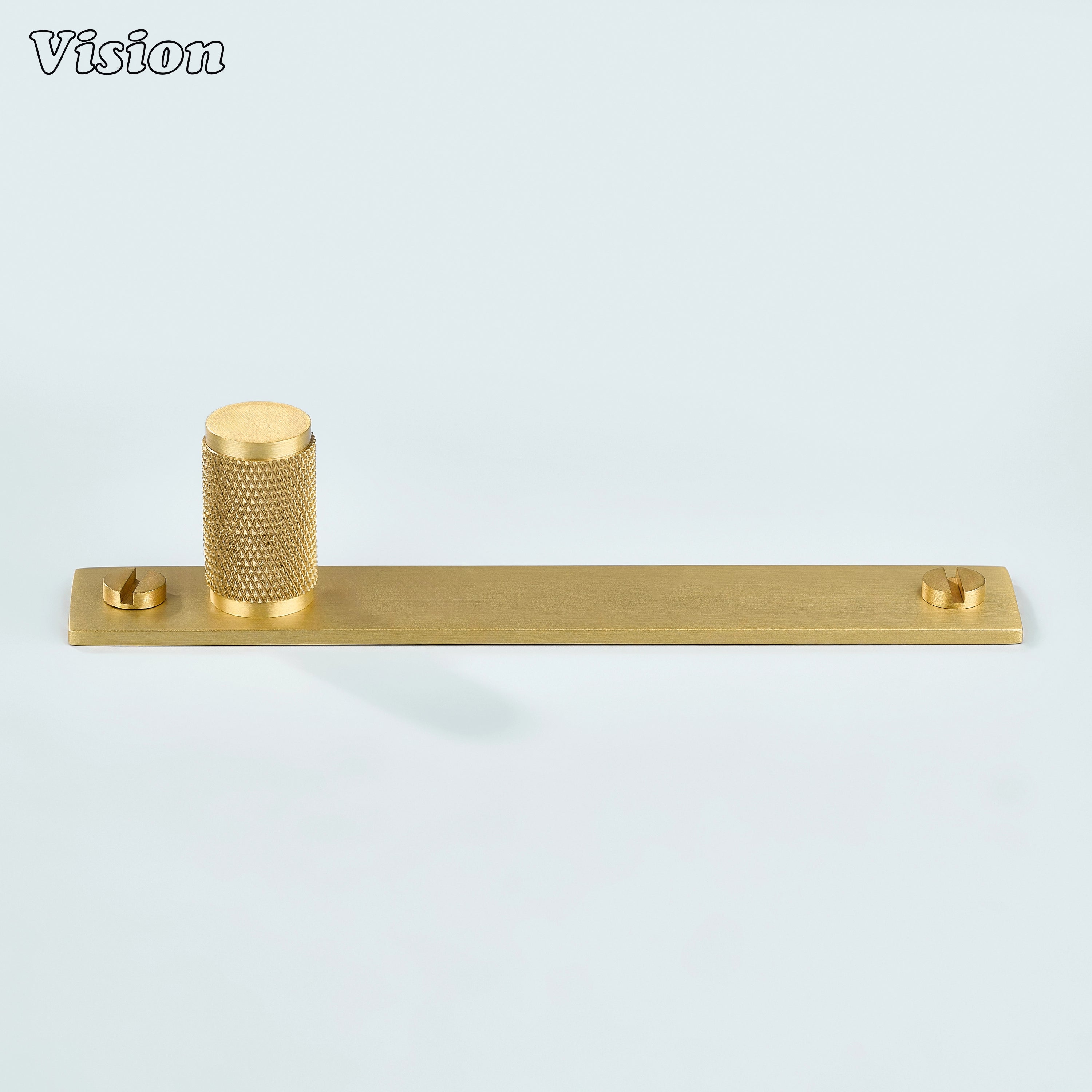 Meridian Knurled Brass Cylinder Knob With Backplate – Gold cabinet knob features a cylindrical diamond knurled profile mounted on a slim rectangular backplate, crafted from premium solid brass with a refined build for kitchen cabinets, wardrobes, drawers, and furniture.